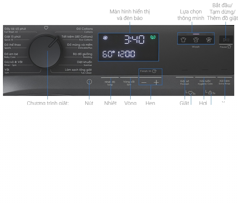 - Bảng điều khiển song ngữ Anh – Việt tích hợp núm xoay, cảm ứng và màn hình hiển thị giúp thao tác nhanh chóng và dễ dàng.