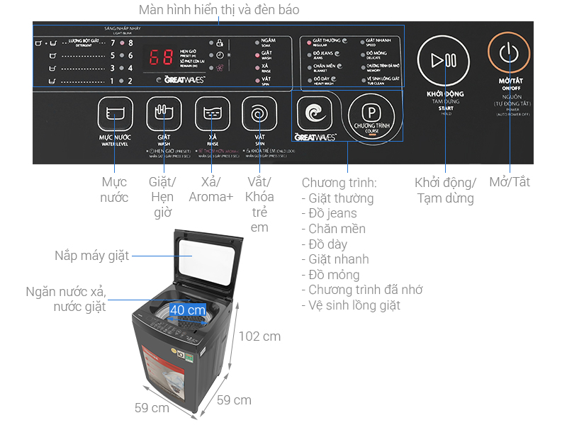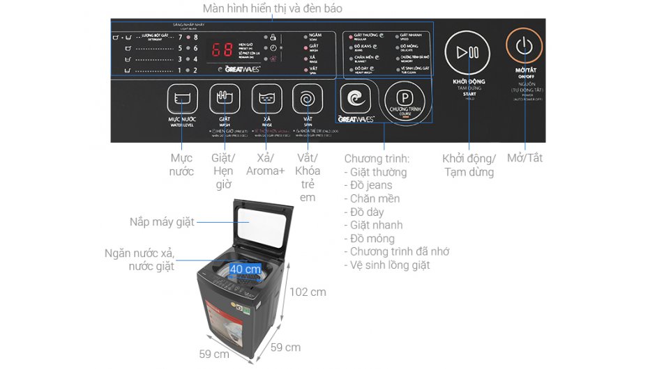 • Công nghệ GreatWaves tăng khả năng giặt sạch, giảm phai màu quần áo.