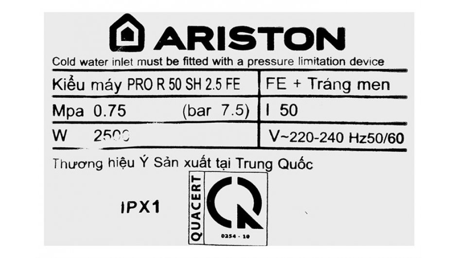 Thông số kỹ thuật Máy nước nóng gián tiếp Ariston 50 lít PRO R 50 SH 2.5 FE